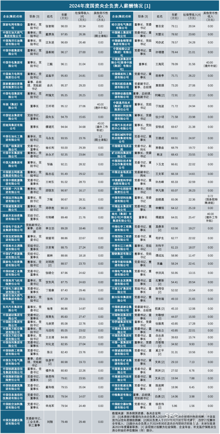 其中,国家电网有限公司董事长、党组书记张智刚2024年1月至3月所任职务为董事、总经理、党组副书记,2024年3月起升任董事长、党组书记,故2024年度应付年薪随职务划分为两项,两项合计应付年薪总额为98万元,位列第一。